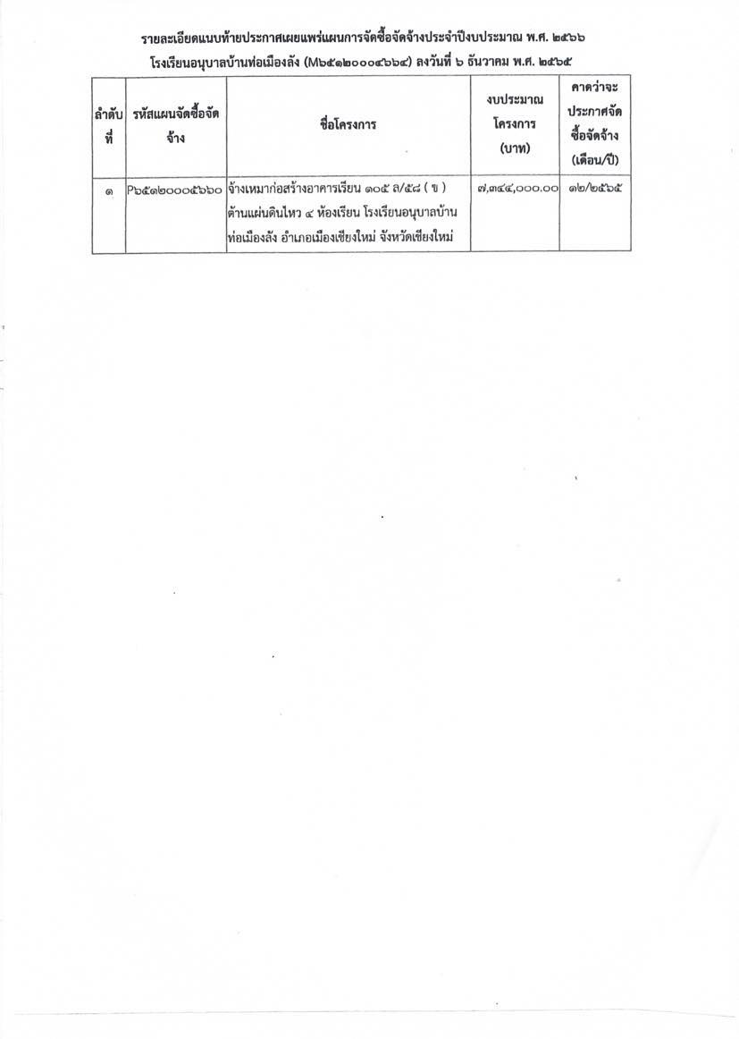 เผยแพร่แผนการจัดซื้อจัดจ้างประจำปีงบประมาณ 2566 จ้างเหมาก่อสร้างอาคารเรียน 105ล/58(ข)