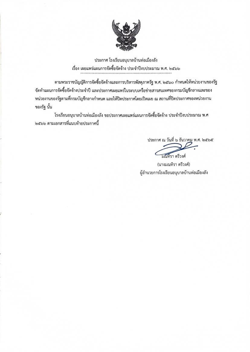 ประกาศโรงเรียนอนุบาลบ้านท่อเมืองลัง เรื่อง เผยแพร่แผนการจัดซื้อจ้าง ประจำปีงบประมาณ พ.ศ. 2566