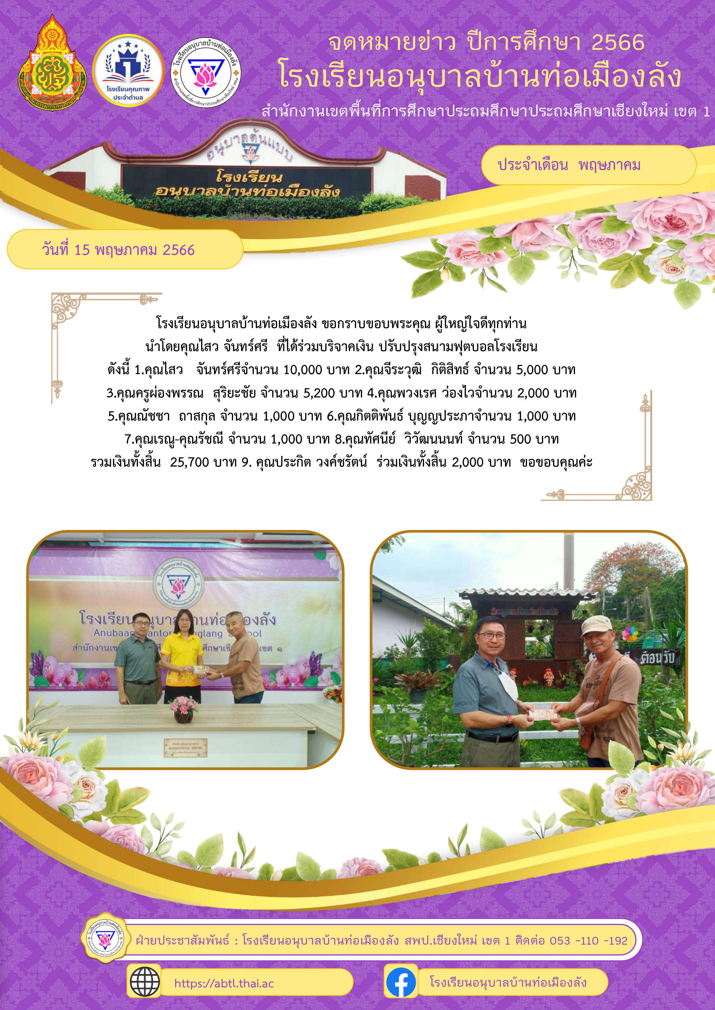 ขอขอบพระคุณผู้ใหญ่ใจดีที่ได้ร่วมบริจาคเงินให้กับการปรับปรุงสนามฟุตบอลของโรงเรียนอนุบาลบ้านท่อเมืองลัง